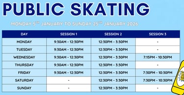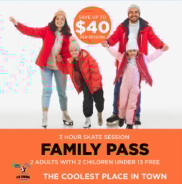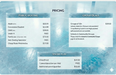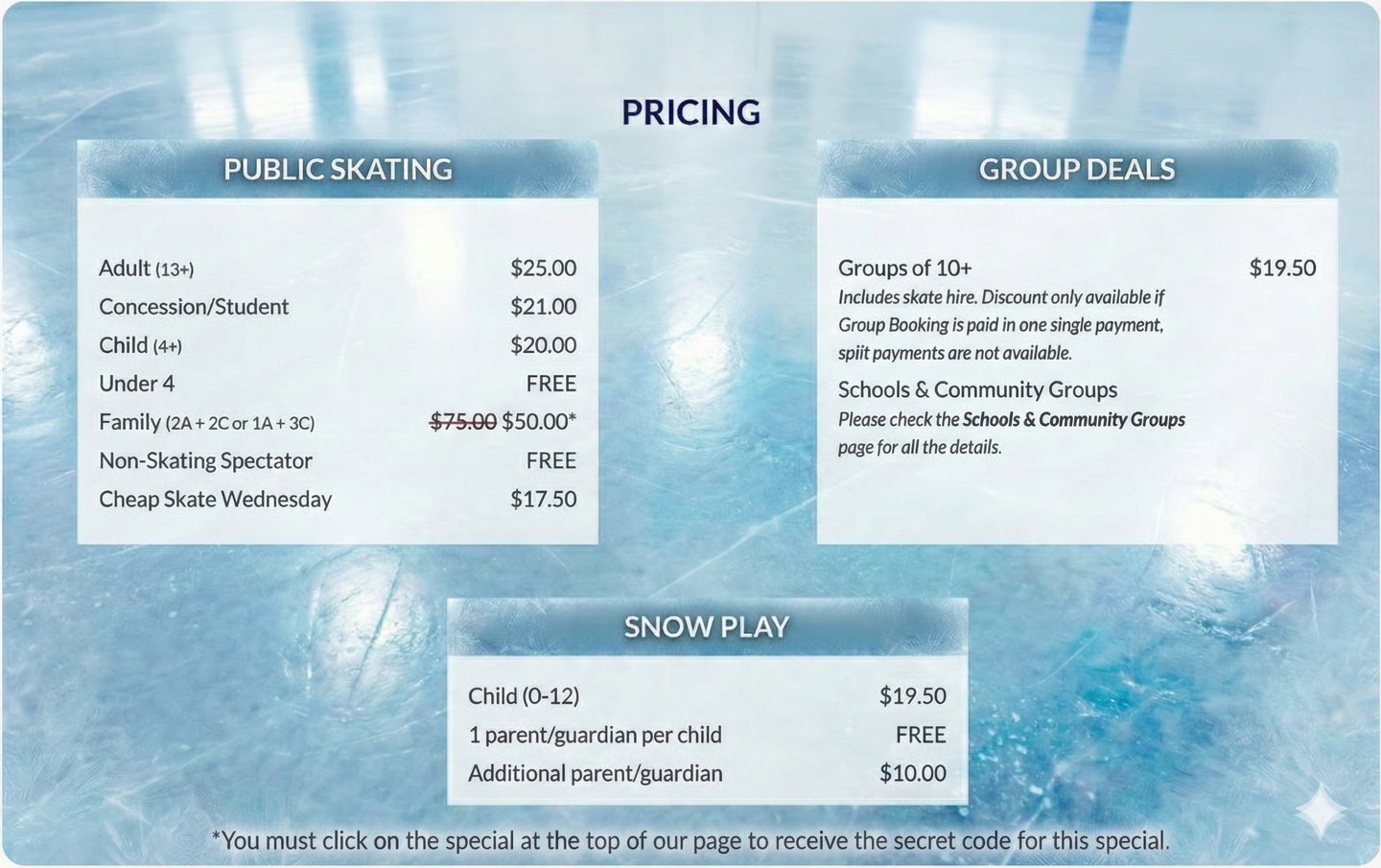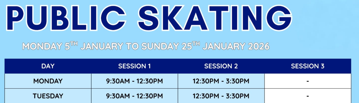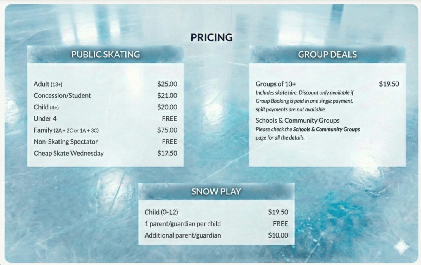Includes skate hire. Discount only available if Group Booking is paid in one single payment, split payments are not available.